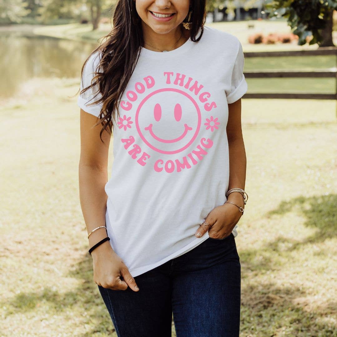 Good Things Are Coming Pink Happy Face Graphic Tee