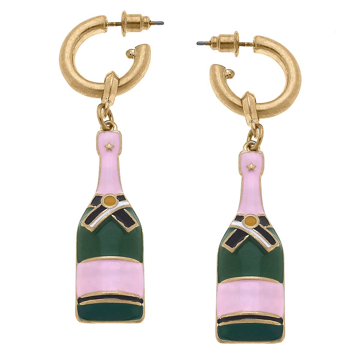 Lola Enamel Champagne Bottle Drop Hoop Earrings in Pink & Gr