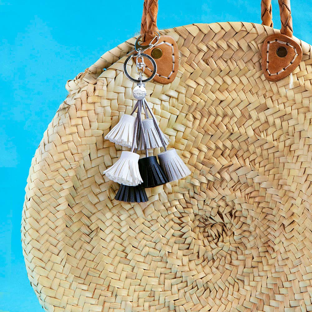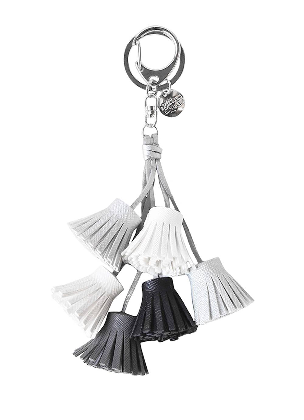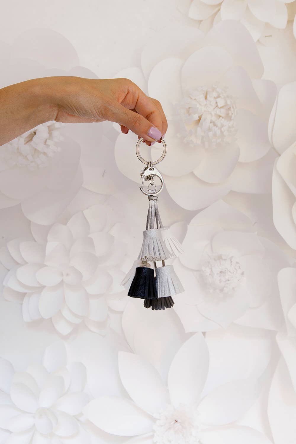 For The Goddess Who Likes Stylish Simplicity - silver keyring with a mix of white, silver and black tassels.
