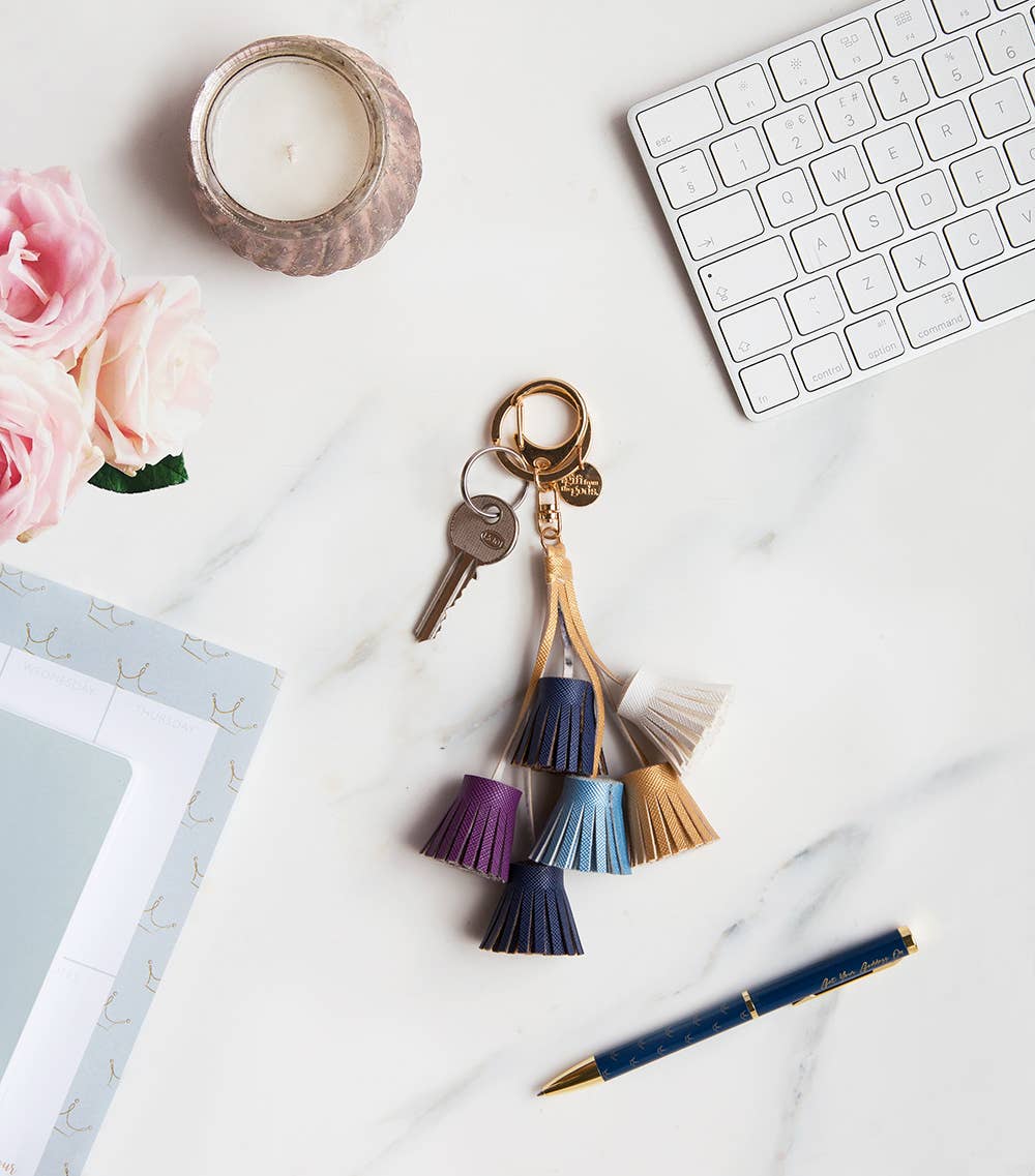 For The Goddess Who Always Wears Her Crown – gold keyring with white, pale blue, gold, purple and navy blue tassels.